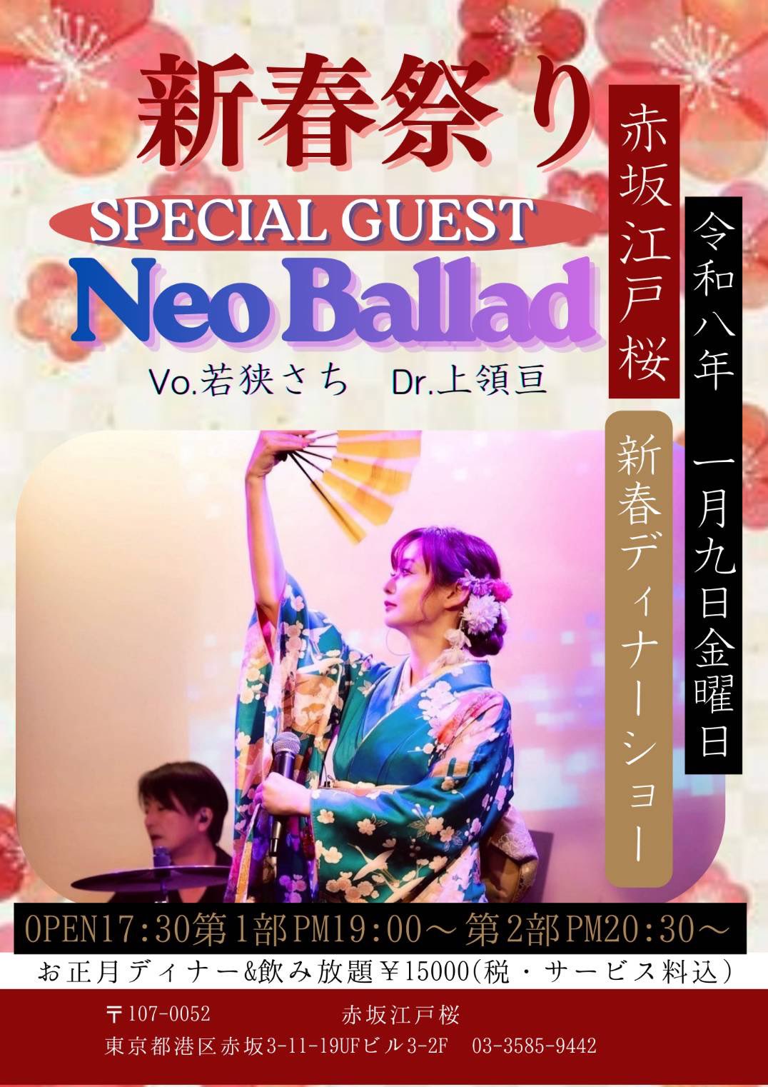 赤坂江戸桜「NeoBallad新春祭り2026」やってきました赤坂江戸桜のとってもお得なエンドレス飲み放題付きディナーショー!2026年の新年をNeoBalladのおめでたい民謡で祝いましょう♪ 【ACT】NeoBallad(Vo.若狭さち Dr.上領亘) 【出演時間…