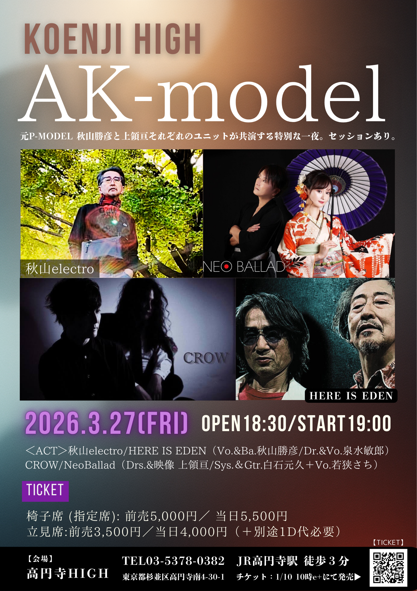 高円寺HIGH「AK-model」元P-MODEL秋山勝彦氏(A)と上領亘(K)のそれぞれ2組のユニットが共演する特別な一夜。NeoBallad楽曲でのセッションも企画。この機会をお見逃しなく!! 【時間】open/start 18:30/19:00 【…