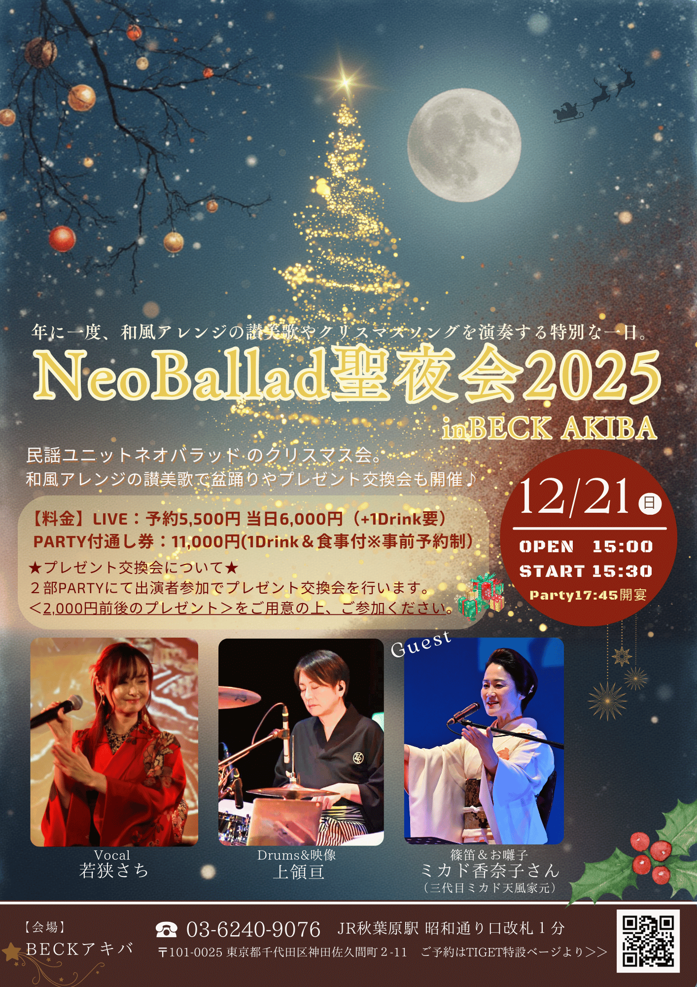 年に一度、民謡の他に和風アレンジの讃美歌やクリスマスソングを演奏する特別な日。Partyではプレゼント交換会も開催!NeoBalladからのプレゼントも当たるかも!?ぜひ楽しみにお越しください♪