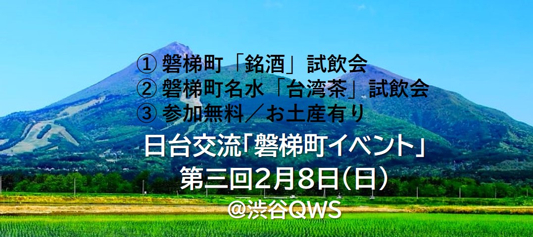 渋谷QWSにて日台交流「磐梯町イベント」第三回を開催します。磐梯町の銘酒の「利き酒会」、磐梯町名水を使用した「台湾茶試飲会」や磐梯町の名産品の展示をいたします。ミニライブも予定しております。ご予約の上、ご参加ください。